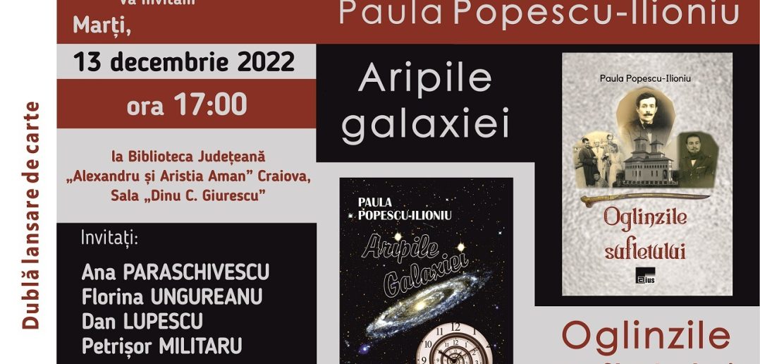 Biblioteca Județeană „Alexandru și Aristia Aman” organizează marți, 13 decembrie 2022, în sala „Acad. Dinu C. Giurescu”, începând cu ora 17.00, lansarea volumelor „Aripile galaxiei” și „Oglinzile sufletului”, autor Paula Popescu-Ilioniu.