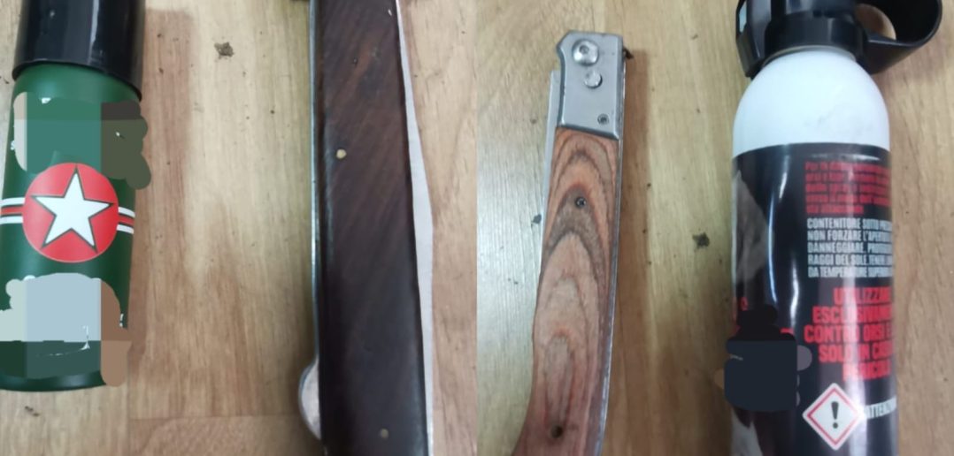 În urma perchezițiiilor efectuate, au fost ridicate în vederea continuării cercetărilor, două recipiente ce contin substanţe iritant-lacrimogene şi 2 obiecte tăietoare-înţepătoare, tip fluture.