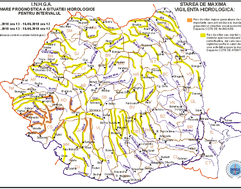Institutul Național de Hidrologie și Gospodărire a apelor a emis un cod galben de scurgeri importante pe versanţi, torenţi şi pâraie, viituri rapide pe râurile mici cu posibile efecte de inundaţii locale şi creşteri de debite şi niveluri pe unele râuri din bazinele hidrografice menţionate, cu depăşiri ale COTELOR DE APĂRARE. Avertizarea este valabilă de aztăzi, de la orele 13,00 și până pe 18 iunie în jurul orelor 12,00 pentru Drincea, Desnăţui (judeţele Mehedinţi şi Dolj), Jiu – bazin superior şi mijlociu şi afluenţi bazin inferior (judeţele Hunedoara, Mehedinţi, Gorj şi Dolj), Olt – bazin superior şi mijlociu, Olt – afluenţi aval S.H. Sebeş Olt (judeţele Harghita, Covasna, Braşov, Sibiu, Vâlcea, Gorj, Dolj, Argeş şi Olt).