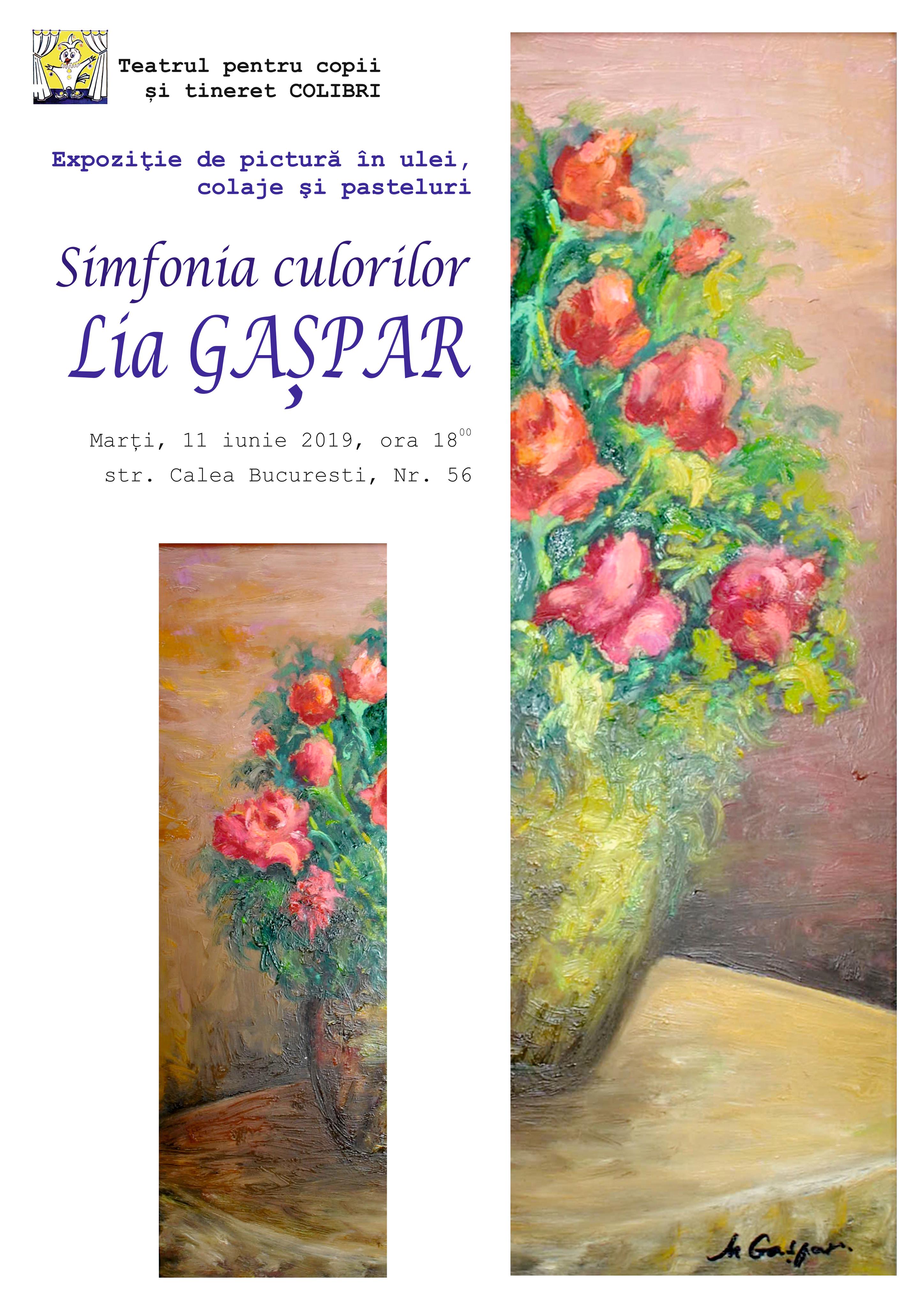 Pictorița Lia Gașpar vernisează marți, 11 iunie 2019, la Teatrul pentru copii și tineret Colibri Craiova, la ora 18:00, expoziția de pictură, colaje și pasteluri „Simfonia culorilor“.