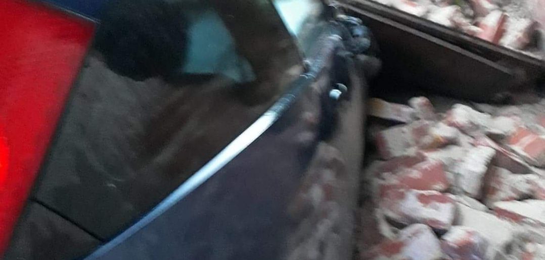 In cadere, caramizi rin zid au avariat un autoturism si mai multi copaci din zona.