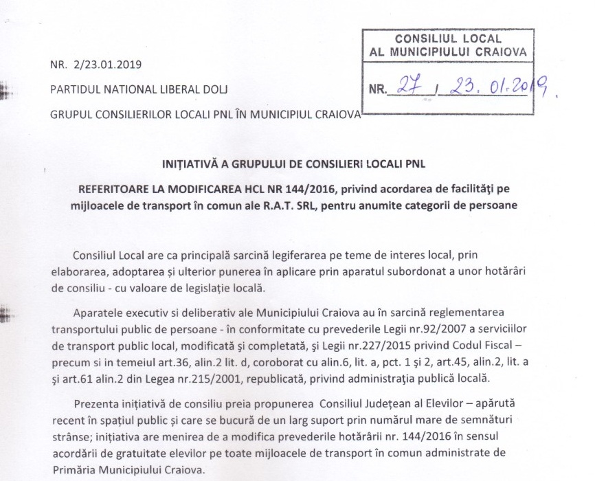 În temeiul prevederilor Legii nr. 92/2007, cu modificările și completările ulterioare, precum si a prevederilor Legii nr. 215/2001 republicată și actualizată, cu modificările și completările ulterioare, grupul consilierilor PNL a solicitat Consiliului Local al Municipiului Craiova acordarea de gratuitate pentru elevi pe toate mijloacele de transport în comun operate de R.A.T. SRL prin înlocuirea continutului art. 1 (1) lit (d) din HCL nr. 144/2016 cu urmatoarea formulare: