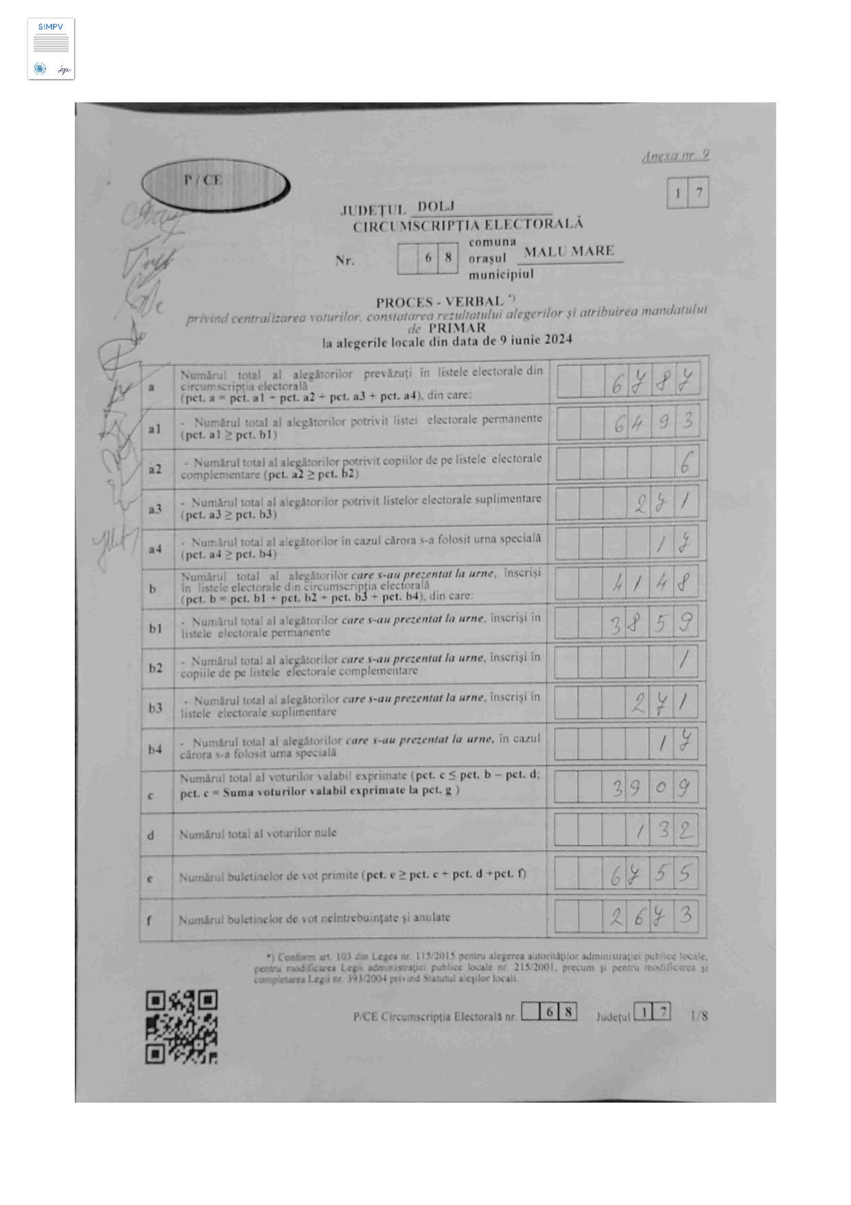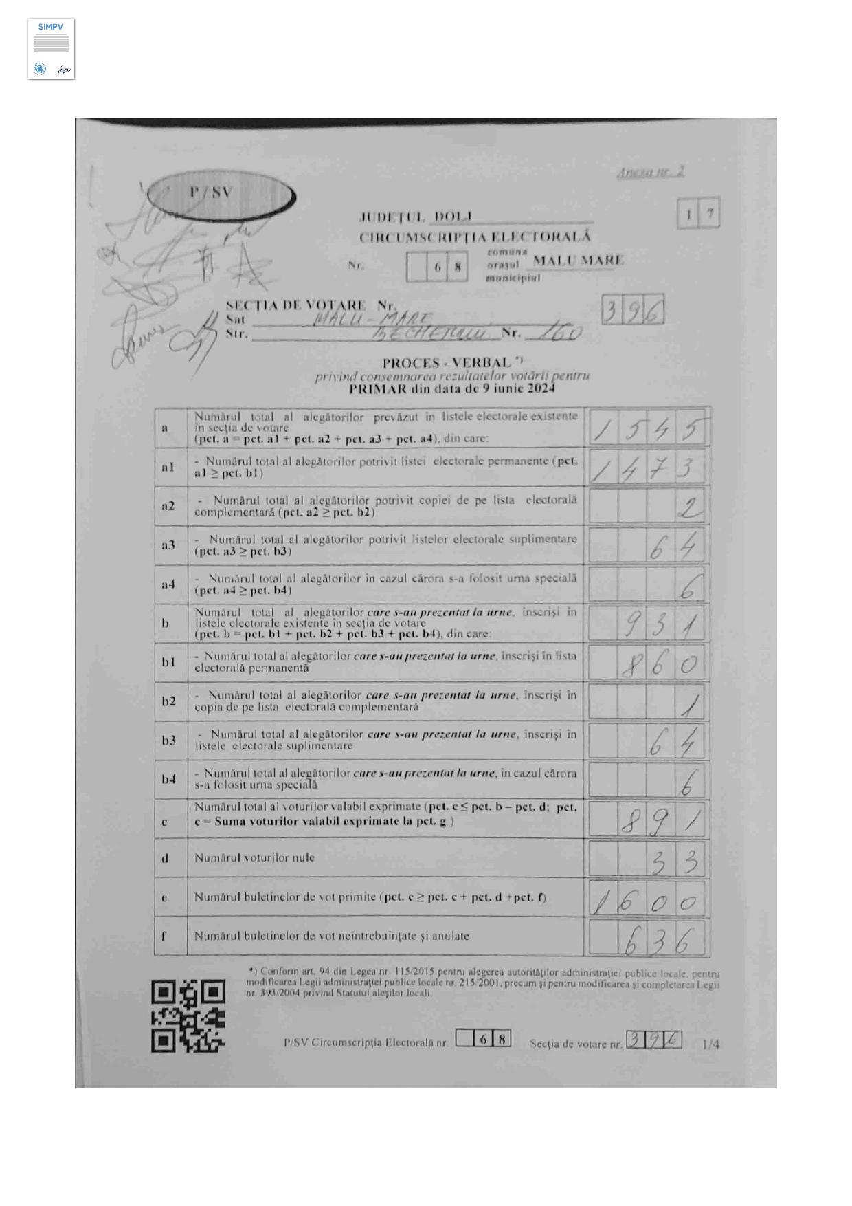 Conform procesului verbal privind centralizarea voturilor pentru funcția de primar, se constată următoarele: