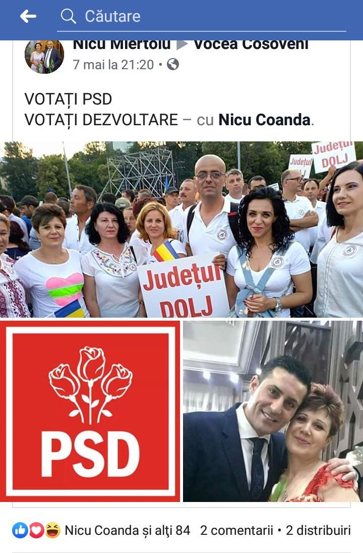 Sus-numita, care are și calitatea de secretar al Primăriei Mârșani, a participat la campania electorală alături de membrii PSD, inclusiv cu primarul Comunei Coșoveni, Coandă Nicușor, lucru dovedit chiar de pozele postate pe rețelele de socializare. Menționăm că participarea la campania electorală a PSD a avut loc chiar și după desemnarea acesteia în funcția de președinte de secție de votare nr 315.