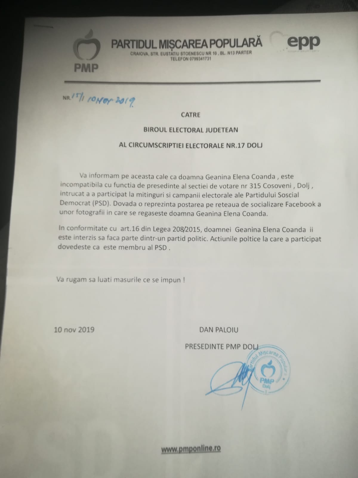 De asemenea, în plângerea depusă de către Partidul Miscarea Populară se arată că „doamna Geanina Elena Coandă este incompatibilă cu funcția de președinte al secției de votare nr. 315 Coșoveni, Dolj, întrucât a participat la mitinguri și campanii electorale ale Partidului Social Democrat (PSD). Dovada o reprezintă postarea de pe rețeaua de socializare Facebook a unor fotografii în care se regăsește doamna Geanina Elena Coandă.