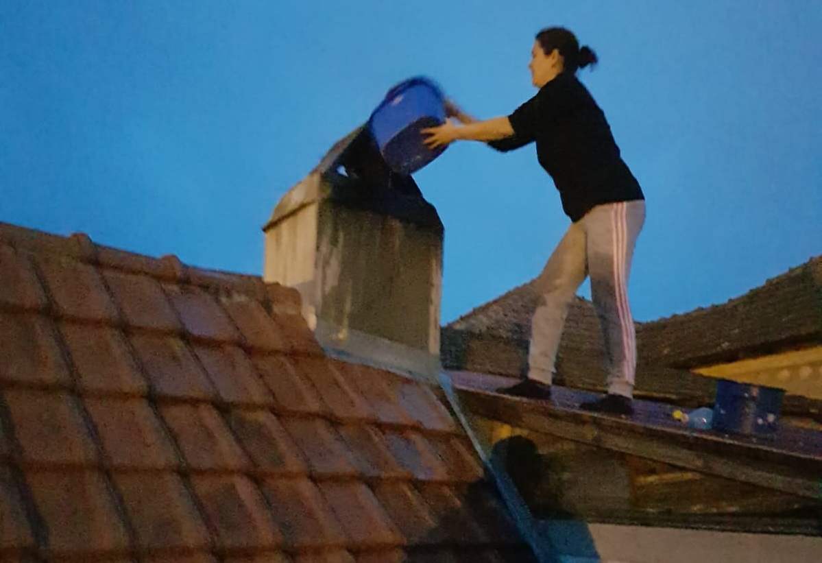În timp ce alerta vecinii, fără a sta pe gânduri, Daniela a urcat pe acoperiş, reuşind să “tempereze” incendiul, alimentându-l cu oţet. Concomitent cu anunţarea evenimentului la 112, soţul acesteia, a mobilizat câţiva vecini reuşind să realizeze un “dispozitiv de stingere”, facilitând intervenţia prin intermediul unor găleţi şi sticle cu apă, date din mână în mână.