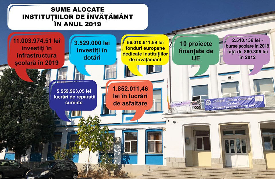 Învățământul este prioritar pentru administrația craioveană. Strategia autorităților locale pentru asigurarea celor mai bune condiții elevilor din Craiova s-a dezvoltat, în ultima perioadă, pe toate palierele: investiții, lucrări de reparații și amenajarea curților și aleilor din școli, grădinițe și licee. În cifre, Municipalitatea a cheltuit, anul acesta, suma totală de 11.003.974,51 lei de la bugetul local, pentru infrastructura școlară. În plus, dintre cele 24 de proiecte accesate de Primăria Craiova prin programul POR 2014-2020 și aflate în diferite faze de implementare sau de contractare, 10 sunt dedicate unităților de învățământ craiovene.
