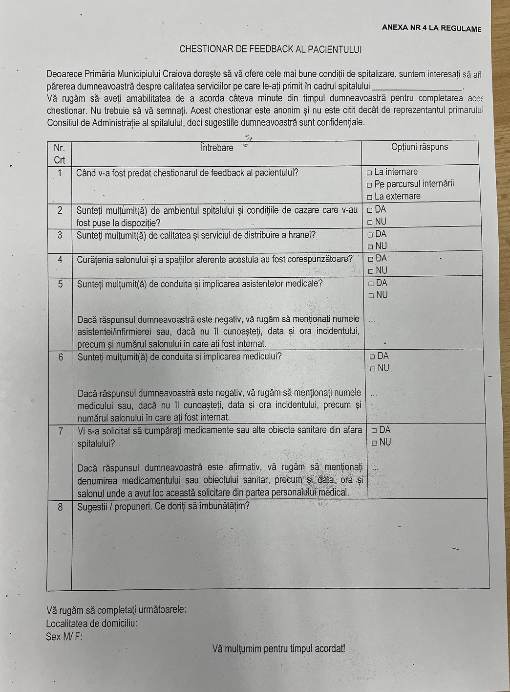 Primarul Craiovei, Lia Olguța Vasilescu, a anunțat, în cadrul unei conferințe de presă, că a va introduce în spitalele din subordinea Primăriei, formulare de evaluare. Acestea vor fi înmânate pacienților și, la externare, vor fi depuse într-o urnă cu inscripția „Primăria Craiova”. „În această perioadă de pandemie am avut mulți prieteni, multe cunoștințe care au fost internate în spitalele noastre, din păcate nu de la toți am auzit cuvinte bune, nu pentru dotarea spitalelor, ci pentru modul în care, uneori, au fost tratați de personalul medical. Este motivul pentru care am decis ca începând din luna februarie să testăm satisfacția pacienților care sunt internați în spitalele noastre. Avem această cutie destinată unor chestionare pe care le vor primi pacienții la internarea în spitalele noastre, le vor avea la dispoziție pe toată perioada internării, iar la externare vor trebui ca aceste chestionare completate să fie introduse în această cutie. La această cutie nu are acces decât reprezentantul primarului în Consiliul de Administrație al spitalului. După ce vom vedea care este feedback-ul vom ști și noi ce mai avem de îmbunătățit și, mai mult decât atât, va conta foarte mult în ceea ce privește evaluare personalului medical, care se face de fiecare dată la începutul anului următor și, bineînțeles, la evaluarea managerilor instituțiilor noastre”, a declarat Olguța Vasilescu.