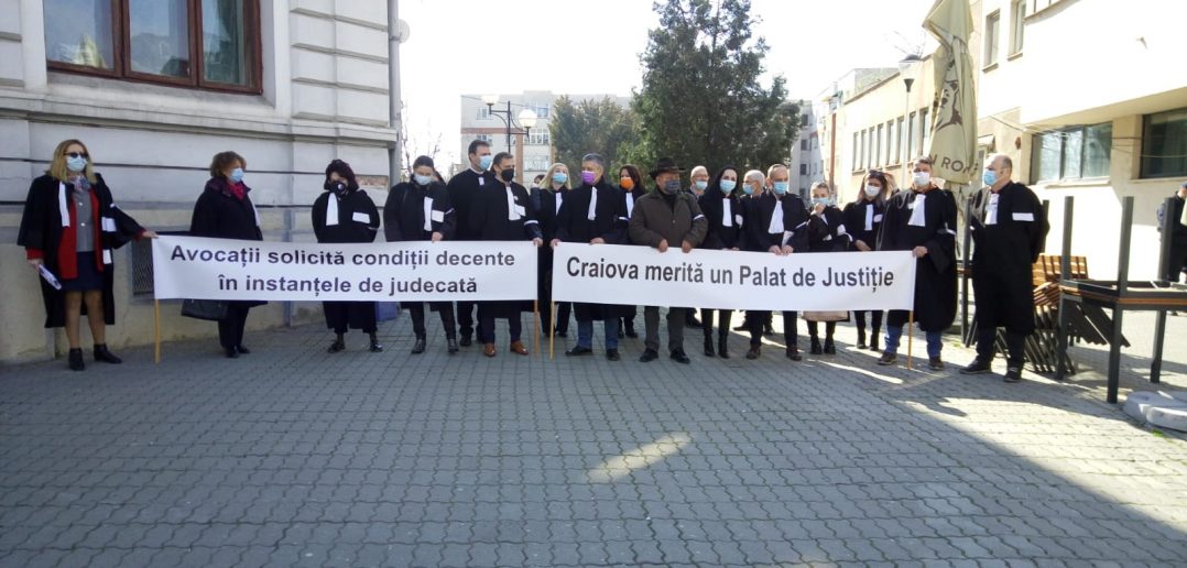 Având în față 2 banere pe care scria „Craiova merită un Palat de Justiție” și „Avocații solicită condiții decente în instanțele de judecată”, mai mulți avocați din cadrul Baroului Dolj au protestat vineri.