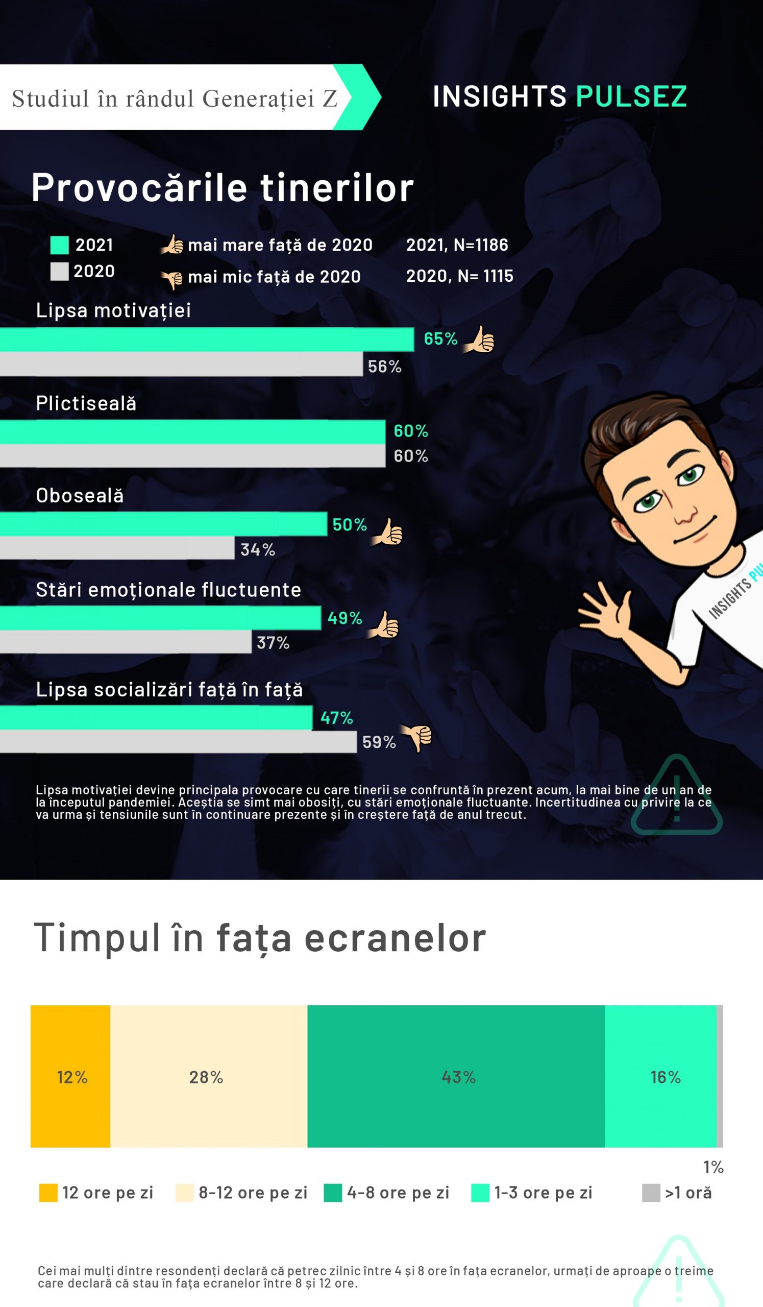 La aproape un an și jumătate de la începutul pandemiei de coronavirus, tinerii generației Z din România au mărturisit că se simt mai obosiți (50% în 2021 vs. 34% în 2020), că se confruntă cu stări emoționale fluctuante (49% în 2021 vs. 37% în 2020), dar și cu momente de incertitudini referitoare la perioada ce va urma, luând în calcul și actualele tensiuni din sfera personală și profesională (32% în 2021 vs. 26% în 2020).
