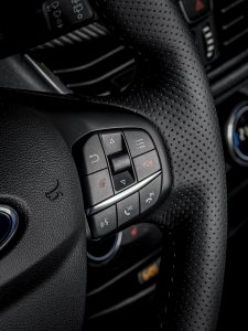 În interior, scaunele sport Recaro din material Miko Dinamica, încălzite și având brodată emblema ST, asigură o bună poziție a șoferului și pasagerului din față. Sunt prezente protecțiile de praguri Ford Performance și emblema ST pe volanul din piele și maneta schimbătorului de viteze. Scaunele, centurile de siguranță și covorașele sunt finisate cu cusături în culoarea Metal Grey.