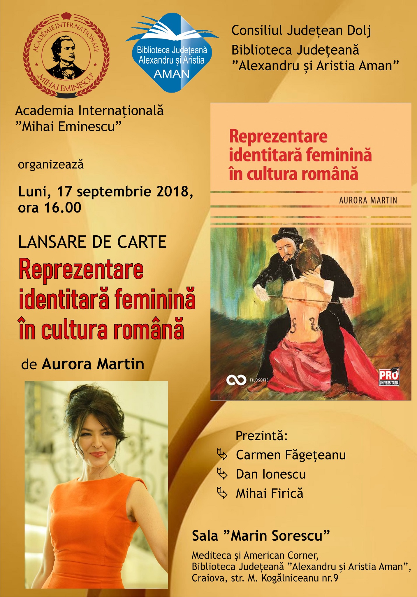 Biblioteca Județeană „Alexandru și Aristia Aman” găzduiește luni, 17.9.2018, începând cu ora 16:00, în sala „Marin Sorescu”, lansarea volumului „Reprezentarea identitară feminină în cultura română”, autor Aurora Martin.
