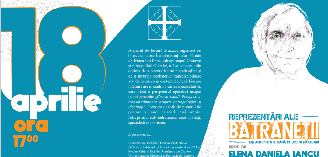 Facultatea de Teologie Ortodoxă din Craiova, în parteneriat cu Biblioteca Județeană „Alexandru și Aristia Aman” Dolj, cu Universitatea de Medicină și Farmacie din Craiova, cu Muzeul Cărții și Exilului Românesc și cu Editura Predania, organizează joi, 18 aprilie 2024, începând cu ora 17, la Muzeul Cărții și Exilului din Craiova, în Sala multimedia – mansardă, cea de a șaptea conferință a Atelierul Synaxis, intitulată „Reprezentări ale bătrâneții în istorie: din Antichitate până în epoca modernă”.