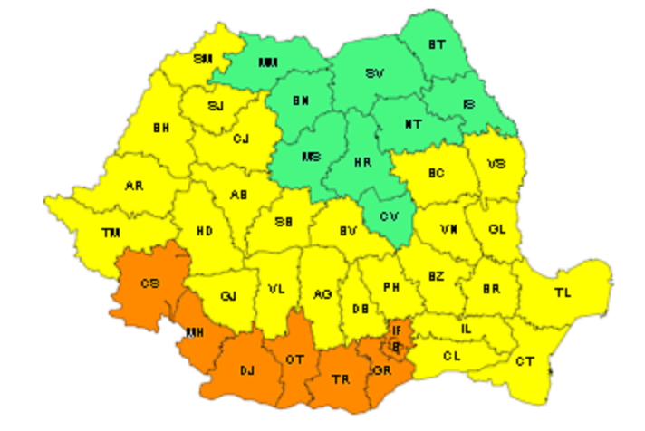 Cos portocaliu: județele Caraș-Severin, Mehedinți, Dolj, Olt, Teleorman, Giurgiu, Ilfov și municipiul București