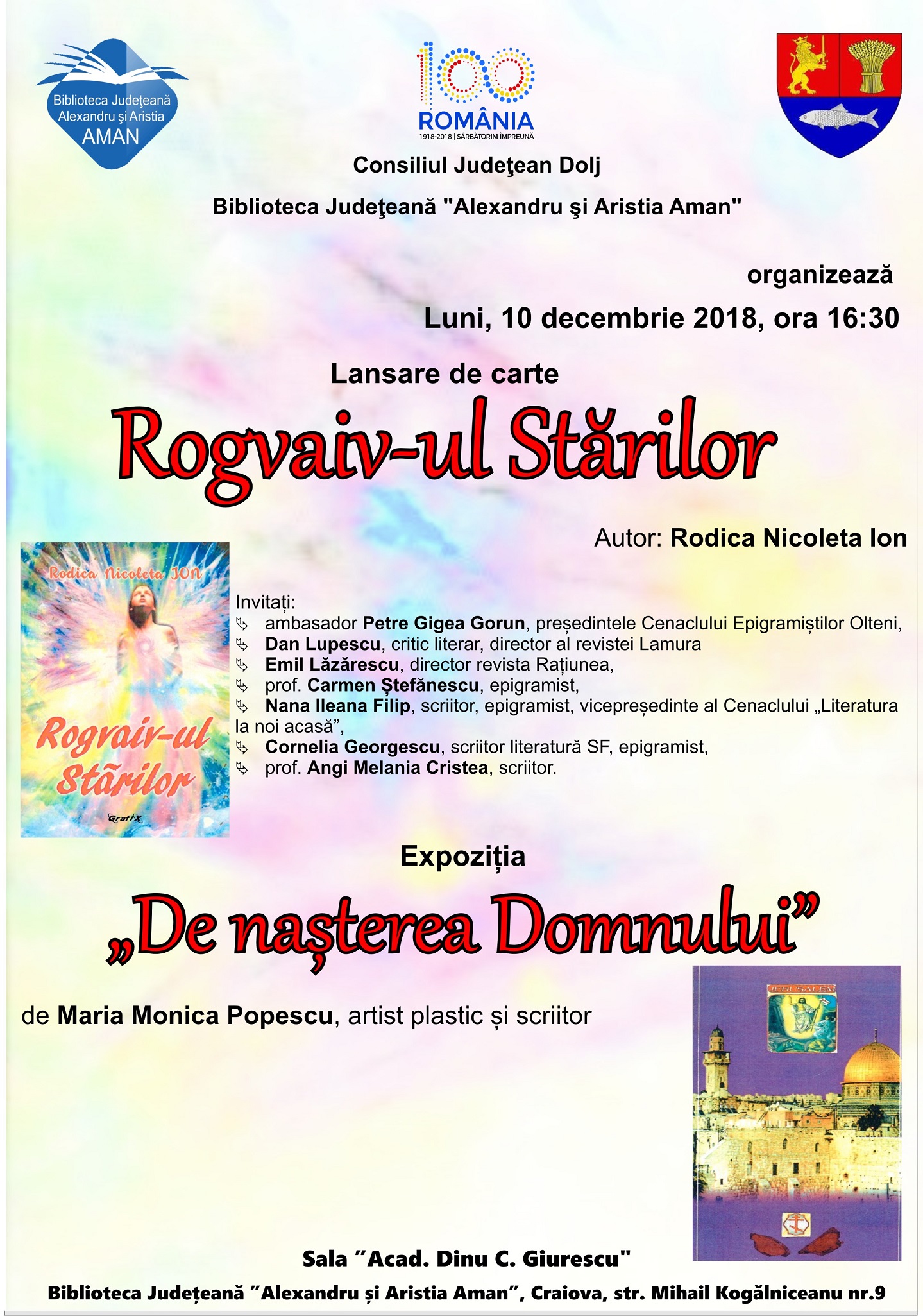 Biblioteca Județeană „Alexandru și Aristia Aman” găzduiește luni, 10 decembrie 2018, cu începere de la ora 16.30, în sala „Acad. Dinu C. Giurescu”, lansarea cărții „Rogvaiv-ul stărilor”, autor Rodica Nicoleta Ion și expoziția „De nașterea Domnului”, a Mariei Monica Popescu, artist plastic și scriitor.