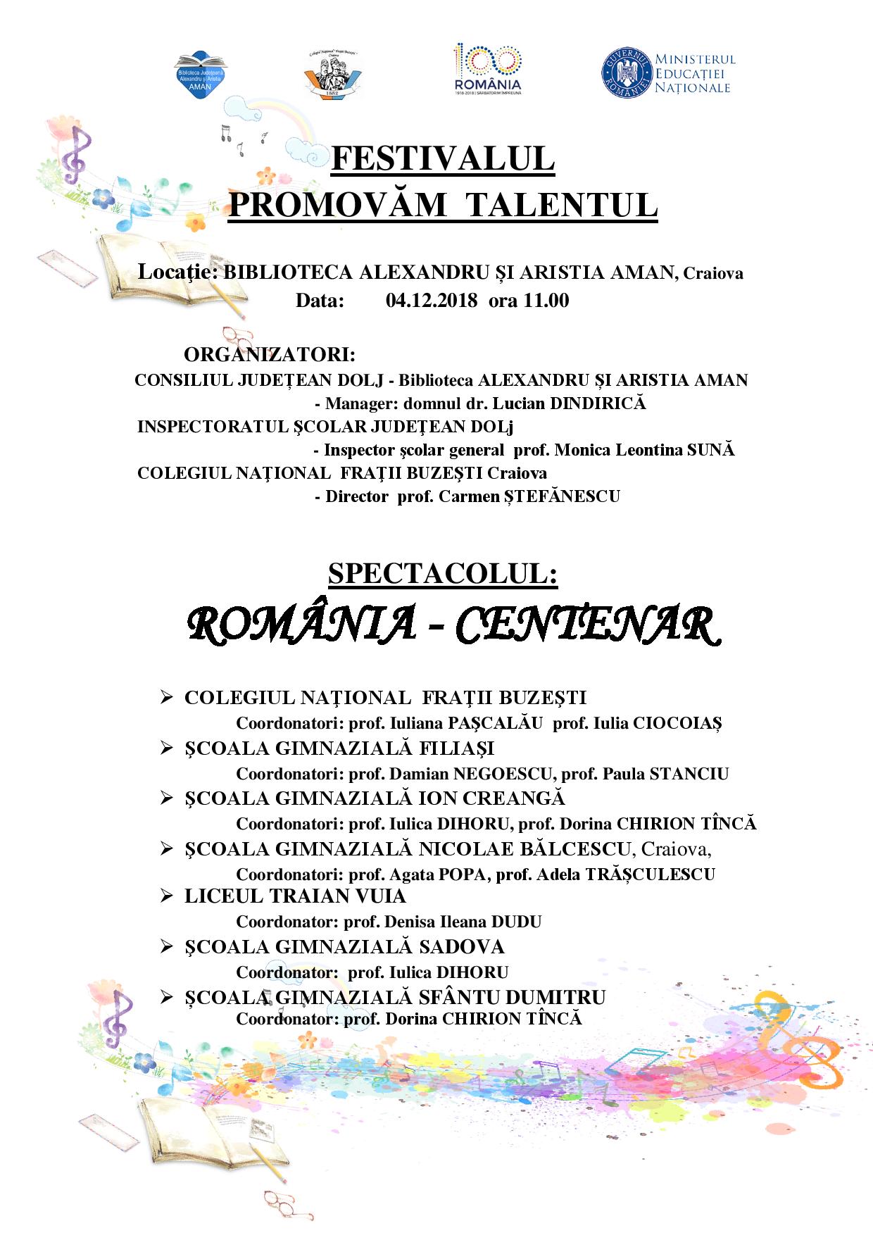 Spectacolul „România Centenar” face parte din seria manifestărilor incluse în programul Festivalului Județean „Promovăm talentul”, festival ajuns la cea de-a VIII-a ediție și organizat de Consiliul Județean Dolj, prin Biblioteca Județeană „Alexandru și Aristia Aman”, Inspectoratul Școlar Dolj și Colegiul Național „Frații Buzești” Craiova.