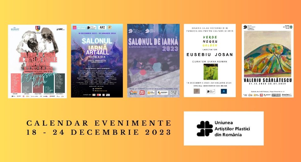 La ora 18, la Galeria de Artă ”Nicolae Mantu” (Strada Domneasca, nr. 19) se inaugurează “Salonul de Iarnă” al artiștilor plastici din Galați. Evenimentul curatoriat și organizat de Consiliul Director al Filialei UAP Galați va fi deschis publicului până pe 6 ianuarie. În ansamblul expozițional de grup vor participa peste 50 de autori, titulari, stagiari și proaspeți absolvenți ai institutelor de arte vizuale. Expoziția oferă o paletă largă de exprimări artistice: pictură, sculptură, grafică, arte decorative și artă sacră. Tematicile abordate sunt complexe, de la portret la peisaj sau de la serialitate, la obiect sau instalație, prin diferite tendințe către figurativ sau nonfigurativ, în funcție de căutările fiecăruia dintre expozanți.