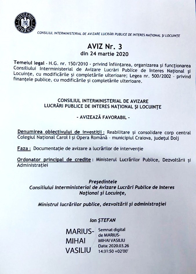 Documentația referitoare la investiția de reabilitare a Colegiului Național „Carol I” și a Operei Române a primit aviz favorabil, în Comisia interministeriala.