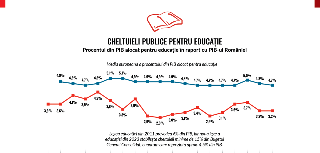 Țara noastră continuă să aloce un procent extrem de scăzut din PIB pentru educație, înregistrând o valoare constantă de 3,2% în 2021 și 2022, mult sub media UE de 4,9%. Această situație subminează dreptul fundamental al copiilor la o educație de calitate, în special pentru cei din medii defavorizate, unde resursele sunt insuficiente de decenii. Discrepanțele între școli, în funcție de zona geografică în care sunt plasate, duc la perpetuarea inechităților și la rata ridicată a abandonului școlar în rândul elevilor din comunități sărace. Este esențială ajustarea costului standard per elev la nevoile reale, în special în zonele vulnerabile, și dezvoltarea unui sistem independent de monitorizare a calității educației, ca măsuri pentru corectarea acestor inechități.