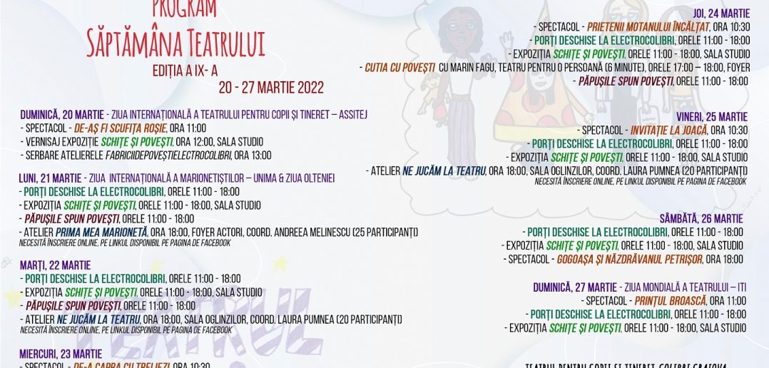 Teatrul pentru copii și tineret Colibri organizează și anul acesta Săptămâna Teatrului, proiect ajuns la cea de-a IX-a ediție și îi invită pe craioveni să se bucure de spectacole, ateliere de creație, Porți Deschise, expoziții, celebrând astfel cele trei mari sărbători: Ziua Internaţională a Teatrului pentru copii şi tineret – 20 martie, Ziua Internațională a Marionetiştilor şi Păpuşarilor – 21 martie şi Ziua Mondială a Teatrului – 27 martie.