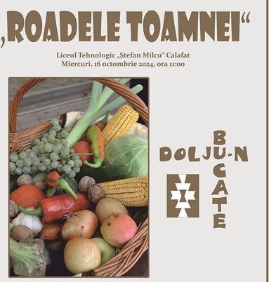 Centrul Județean pentru Conservarea şi Promovarea Culturii Tradiţionale Dolj sărbătorește „Roadele Toamnei“ la Calafat, miercuri, 16 octombrie 2024, alături de Liceul Tehnologic „Ștefan Milcu“ și Școala Gimnazială „Constantin Gerotă“, de Liceul Teoretic ,,Gheorghe Vasilichi“ din comuna Cetate, Liceul Teoretic „George Șt. Marincu“ Poiana Mare și de Palatul Copiilor Craiova – Structura Calafat.