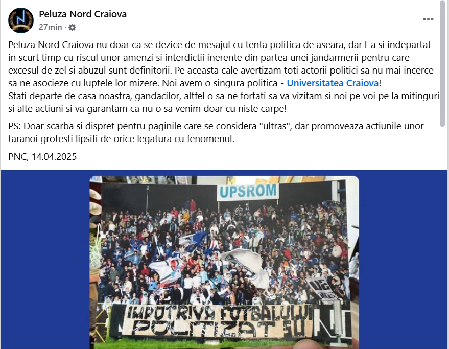 La rândul lor, fanii craioveni, au luat poziție și s-au delimitat de acțiunea despre care spun că nu-i caracterizează și că „singura politică – Universitatea Craiova”.