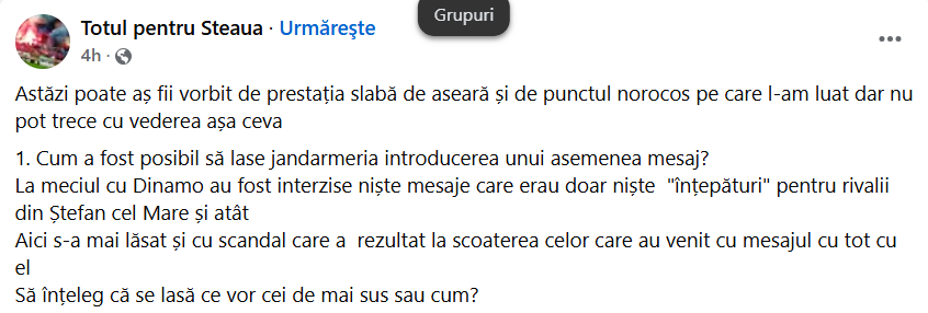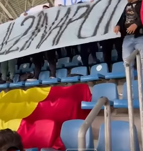 Nici fanii echipei oaspete nu au lăsat netaxat acest aspect! Mai mult decât atât, și ei acuză Jandarmeria de faptul că au permis accesul în stadion cu un astfel de banner.