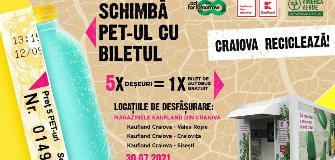 Asociația Act for Tomorrow și Kaufland România lansează campania „Schimbă PET-ul cu Biletul” la Craiova, care încurajează cetățenii să dea 5 deșeuri (PET, sticlă sau doze de aluminiu) la schimb pentru două călătorii gratuite cu autobuzul, în ziua de vineri, 30 iulie 2021, în contextul programului Vinerea Verde, lansat de Ministerul Mediului, Apelor și Pădurilor.