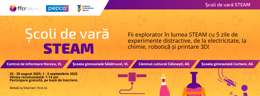 Fundația Comunitară Vâlcea anunță cu bucurie lansarea a patru Școli de Vară STEAM gratuite pentru copii, organizate în perioada 25 – 29 august, în localitatea Sălătrucel și în localitatea Horezu, în județul Vâlcea. În județul Argeș, școlile de vară se desfășoară la Călinești, în perioada 25 – 29 august și la Corbeni, în perioada 1 – 5 septembrie. Școala de vară de la Horezu se desfășoară în parteneriat cu Asociația Project IVI si grupul de inițiativă Digital Village. Activitățile sunt gândite să aprindă curiozitatea copiilor pentru știință, oferindu-le celor mici metode practice și distractive de a învăța noțiuni de știință, tehnologie, inginerie, artă sau matematică.