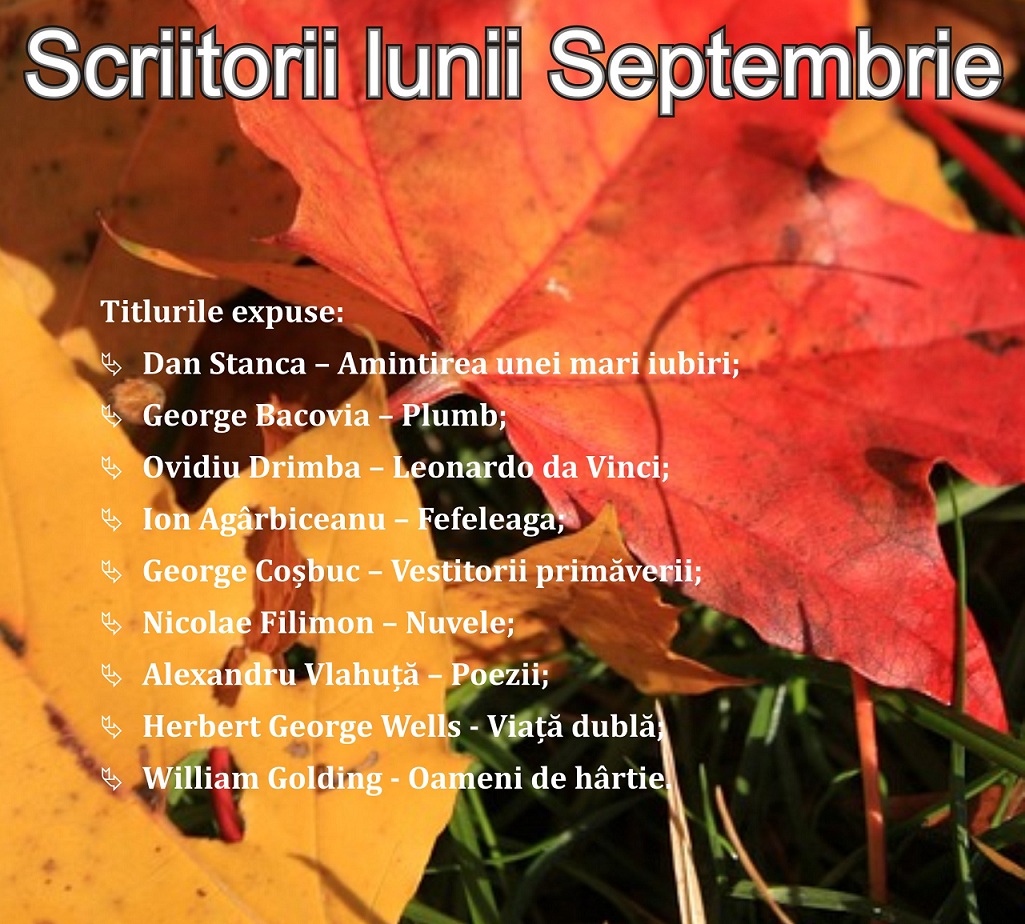 Expoziția poate fi vizitată până la finalul lunii în curs. Toți autorii incluși cu una sau mai multe cărți în cadrul expoziției sunt născuți în luna septembrie.