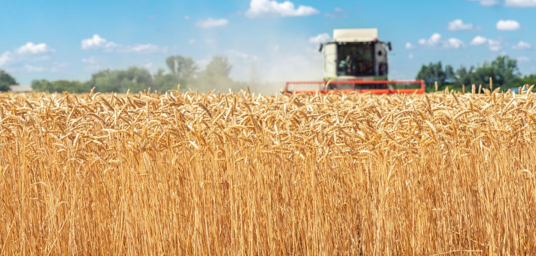 Scenic front view Big powerful industrial combine harvester machine reaping golden ripe wheat cereal field on bright summer or autumn day. Agricultural yellow field machinery landscape background.