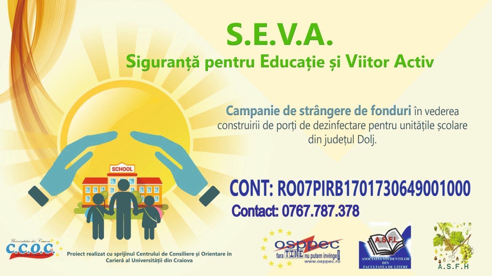 „Împreună pentru educație”. Studenții Organizației Studenților Politehniști Profil Electric Craiova (OSPPEC), Asociației Studenților din Facultatea de Litere (ASFL) și Asociației Studenților din Facultatea de Horticultură (ASFH), cu sprijinul Centrului de consiliere şi orientare în carieră (CCOC) al Universităţii din Craiova, lansează iniţiativa civică „SEVA – Siguranță pentru educație și viitor activ”, ce constă într-o campanie de strângere de fonduri pentru construirea unor porți de dezinfectare pentru unitățile școlare din județul Dolj.