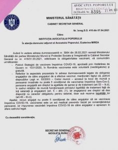 În apărarea dreptului de a nu se vaccina, sindicaliștii prezintă o adresă a Ministerului Sănătății care, într-un răspuns remis Avocatului Poporului prin care indică în mod clar si fără echivoc, faptul că accesul angajaților la locul de muncă nu poate fi condiționat de vaccinare împotriva noului coronavirus, toate persoanele având drepturi egale de șanse și tratament, iar impunerea vaccinării obligatorii de către angajator este în afara cadrului legal.