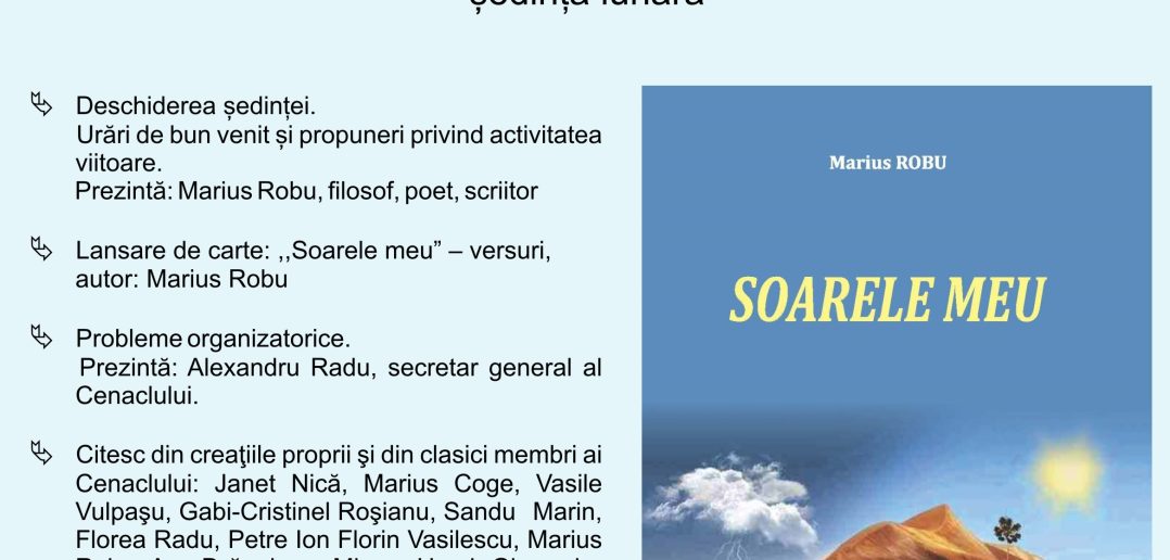 În cadrul ședinței va avea loc lansarea volumului „Soarele meu”, autor Marius Robu, urmată de un moment artistic oferit de membrii Cenaclului Epigramiștilor Olteni, care vor recita poezii și epigrame.