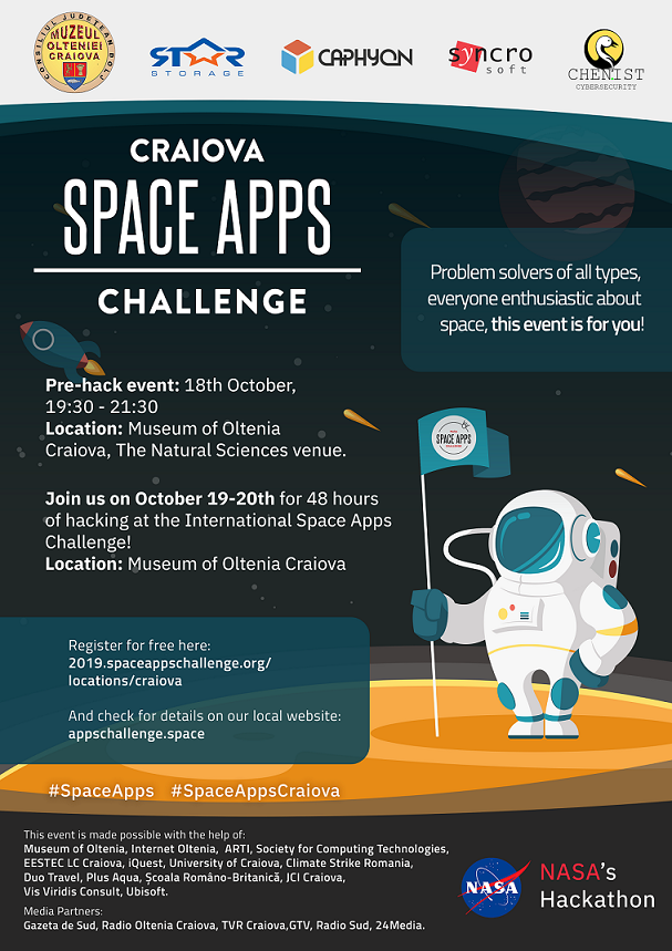 Vineri, 18 octombrie, între orele 18:30-20:30, la sediul Secţiei de Ştiinţele Naturii din cadrul Muzeului Olteniei (str. Popa Şapcă nr. 8), se va desfășura “Pre-hack NASA hackathon”, evenimentul de lansare în care vor fi prezentate temele, provocările, mentorii, juriul şi întregul concept al evenimentului, iar participanții au șansa să se cunoască, să formeze echipe și să aleagă temele pe care vor lucra începând cu a doua zi.