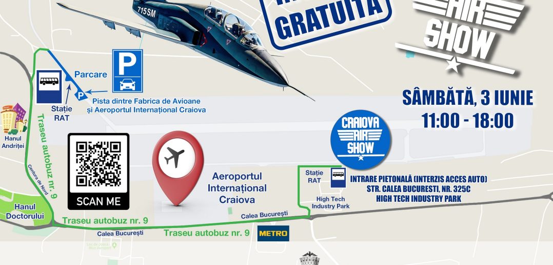 Sâmbătă, 3 iunie 2023, pe Aeroportul Internațional Craiova, va avea loc cel mai mare spectacol aviatic din Oltenia: Craiova Air Show. Pasionații de adrenalină sunt așteptați, începând cu ora 11.00, la intrarea din zona destinată publicului, pe str. Calea București nr. 325C, în incinta High Tech Industry Park.