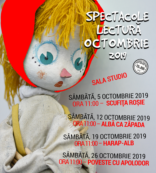 Poveștile care vor deschide în octombrie seria spectacolelor – lectură la Colibri sunt: Scufița Roșie (05 octombrie), Albă ca Zăpada (12 octombrie), Harap-Alb (19 octombrie) și Poveste cu Apolodor (26 octombrie). Acestea vor fi citite și ilustrate de actorii Rodica Prisăcaru și Mugur Prisăcaru cu mijloace specifice teatrului de animație, spectatorii fiind mereu implicați în poveste.