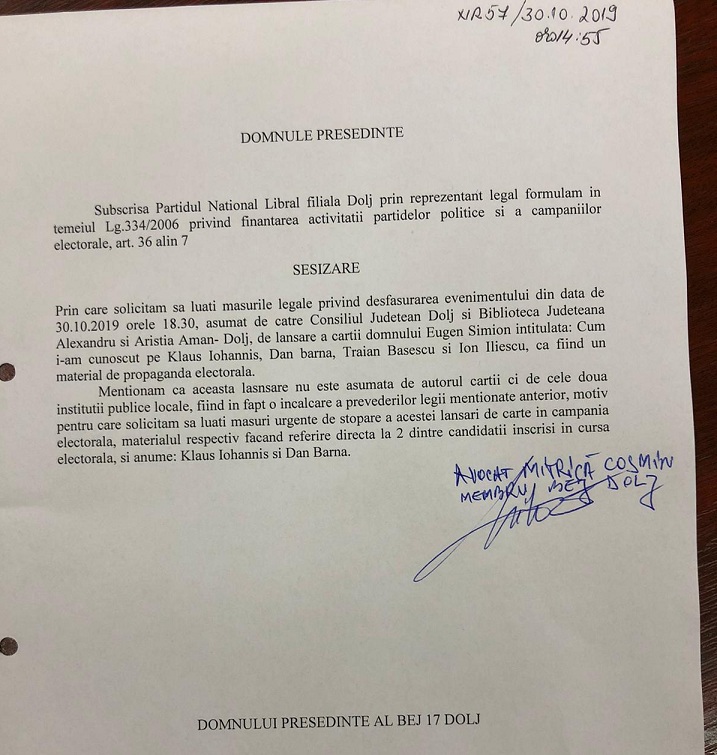 Prin organizarea și susținerea materială a lansării volumului “Cum i-am cunoscut pe Klaus Iohannis, Dan Barna, Traian Băsescu și Ion Iliescu” scris de George Simion. Cerem explicații Consiliului Județean Dolj și managerului Bibliotecii “Alexandru și Aristia Aman” pentru politizarea unei instituții publice, implicarea directă în campania electorală prezidențială și cheltuirea fondurilor publice în scop partinic. Acest aspect a fost semnalat și de către liderul consilierilor județeni PNL, Călin Cosmin, în cadrul unei conferințe de presă ce a avut loc astăzi la sediul PNL Dolj.