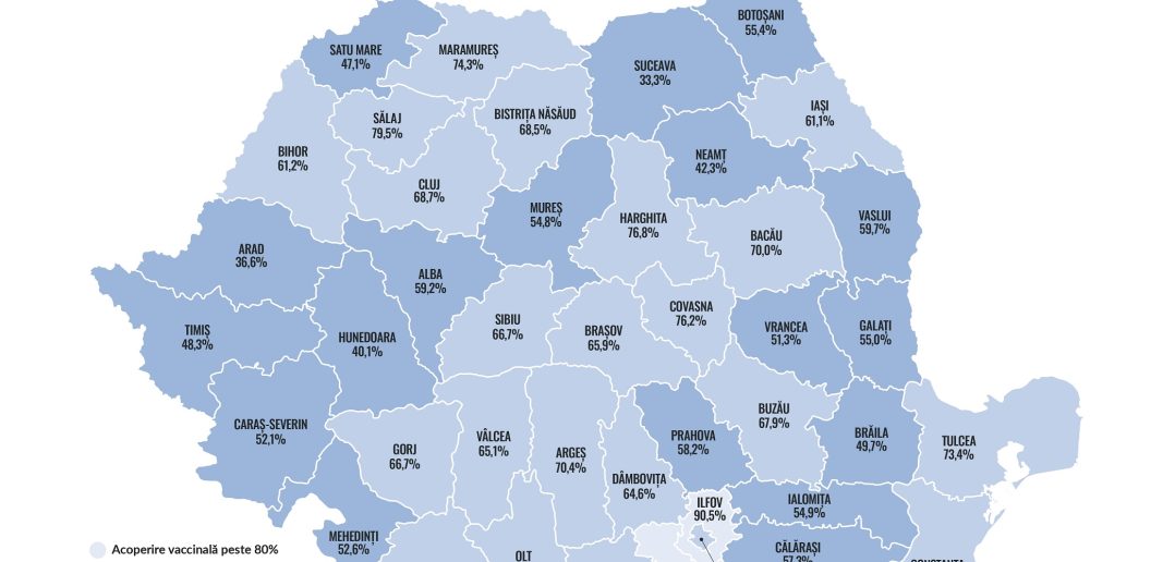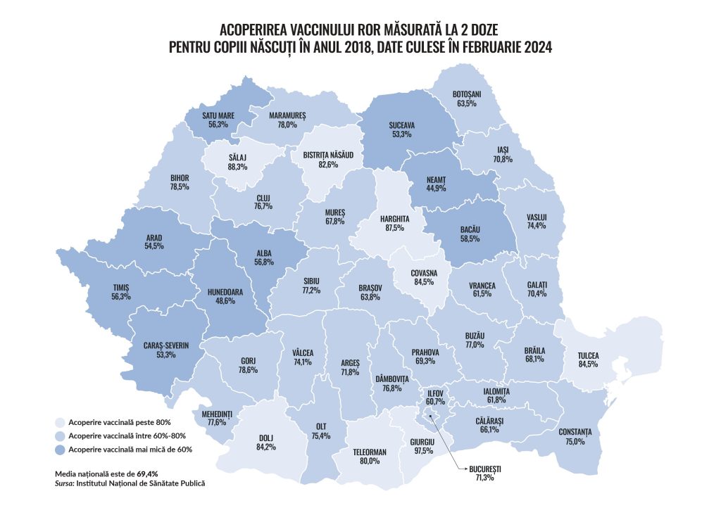Datele culese în februarie 2024 pentru copiii născuți în anul 2018, acoperire măsurată la două doze, arată că media națională a vaccinării pentru ROR este de 69,4% (urban – 68,5%, rural – 70,6%), cu discrepanțe mari între județe: