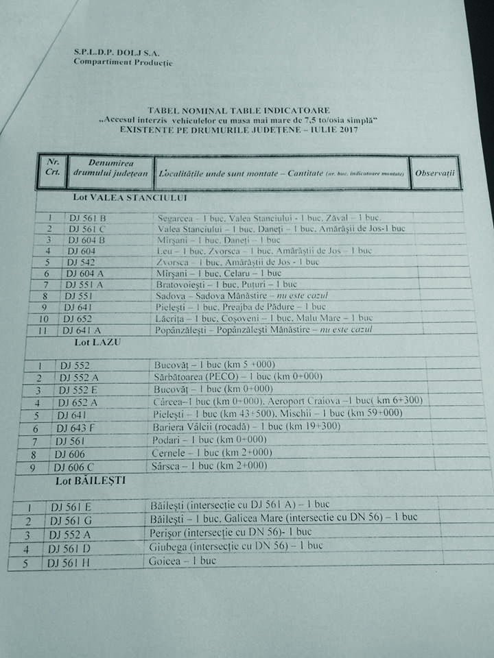 „Ca urmare a intervenției mele în ședința de plen a Consiliului Județean Dolj desfășurată săptămana trecută, astăzi, la ședința extraordinară, consilierii județeni au primit la mapă, o informare din partea SPLDP DOLJ S.A. – societate aflată în subordinea Consiliului Județean Dolj, cu privire la loturile de producție de pe raza județului Dolj unde au fost montate indicatoare rutiere (limitatoare de tonaj), numărul acestora, precum și loturile suplimentare unde vor fi montate aceste indicatoare rutiere – „Accesul interzis vehiculelor cu masa mai mare de 7,5 tone/ osia simplă”, în perioada imediat următoare. Am atras atenția din nou, în plenul ședinței, de faptul că mai sunt și alte drumuri județene ce necesită amplasarea acestor indicatoare, solicitând celor implicați în acest proces, ca în perioada imediat următoare, să avem o întrevedere, pentru a ne sincroniza, punându-le la dispoziție situația pe care o dețin eu.