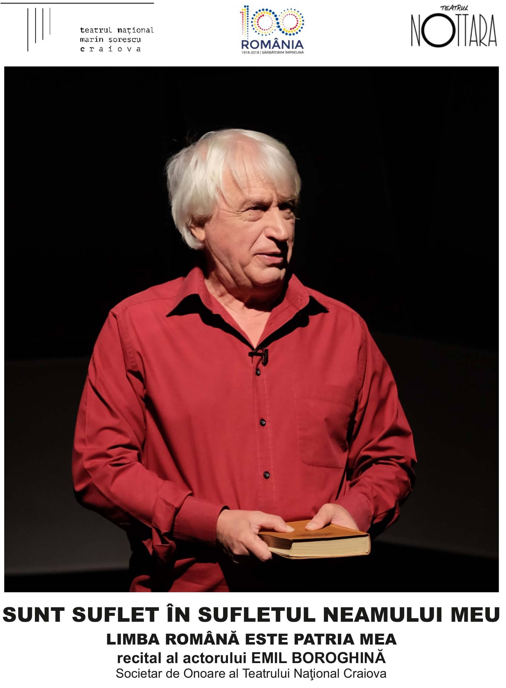 Cu ocazia aniversării Unirii Principatelor Române, miercuri, 24 ianuarie 2018, ora 17, este programată în sala „Ion D. Sîrbu” a Teatrului Naţional „Marin Sorescu” Craiova, cea de a doua premieră din cadrul proiectului „Glasurile patriei-glasurile istoriei, glasurile poeziei”, dedicat sărbătoririi Centenarului făuririi Marii Uniri şi desăvârşirii Statului Naţional Unitar Român, recitalul „Sunt suflet în sufletul neamului meu-Limba română este patria mea”, susţinut de actorul Emil Boroghină, Societar de Onoare al Teatrului Naţional Craiova, regia fiind semnată de Alina Hiristea, iar conceptul video de Cristian Negoescu.