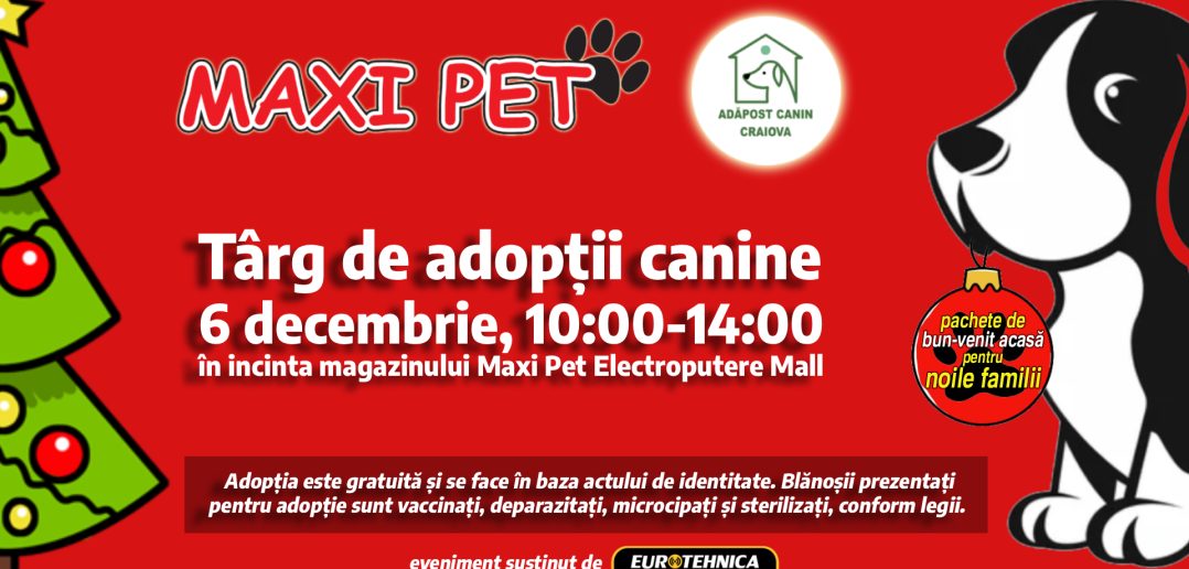 Salubritate Craiova, prin Serviciul de Gestionare a câinilor fără stăpân, organizează un nou târg de adopții canine, alături de sponsorul Maxi Pet România! De data aceasta, evenimentul va avea loc în incinta magazinului Maxi Pet Electroputere Mall (Calea București nr. 78C – 78D, aripa de Vest, Clădirea C2, Unitatea G10a), pe data de 6 decembrie 2025, între orele 10:00 și 14:00.