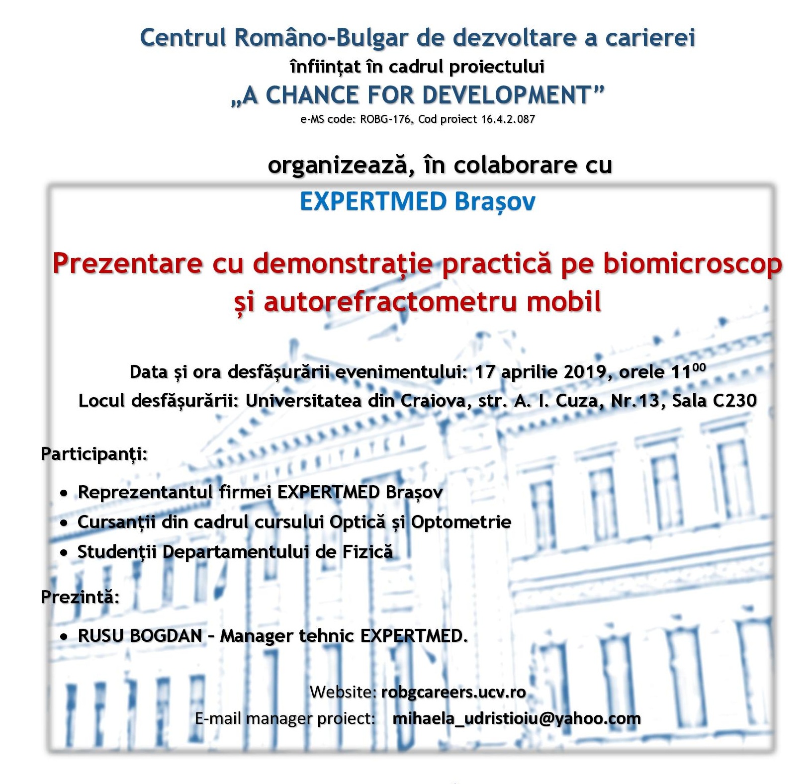 Workshop cu specialişti de top la Ştiinţe. Joi, 18 aprilie 2019, la ora 11, studenţii Departamentului de Fizică (Facultatea de Ştiinţe) și cursanții de la Optometrie sunt invitaţi la o demonstraţie practică pe biomicroscop şi autorefractometrul portabil, susţinută de managerul tehnic al Expertmed, Bogdan Rusu, în laboratorul de Optometrie, C230. Evenimentul este organizat în cadrul Centrului de carieră şi recrutare Ro – BG.