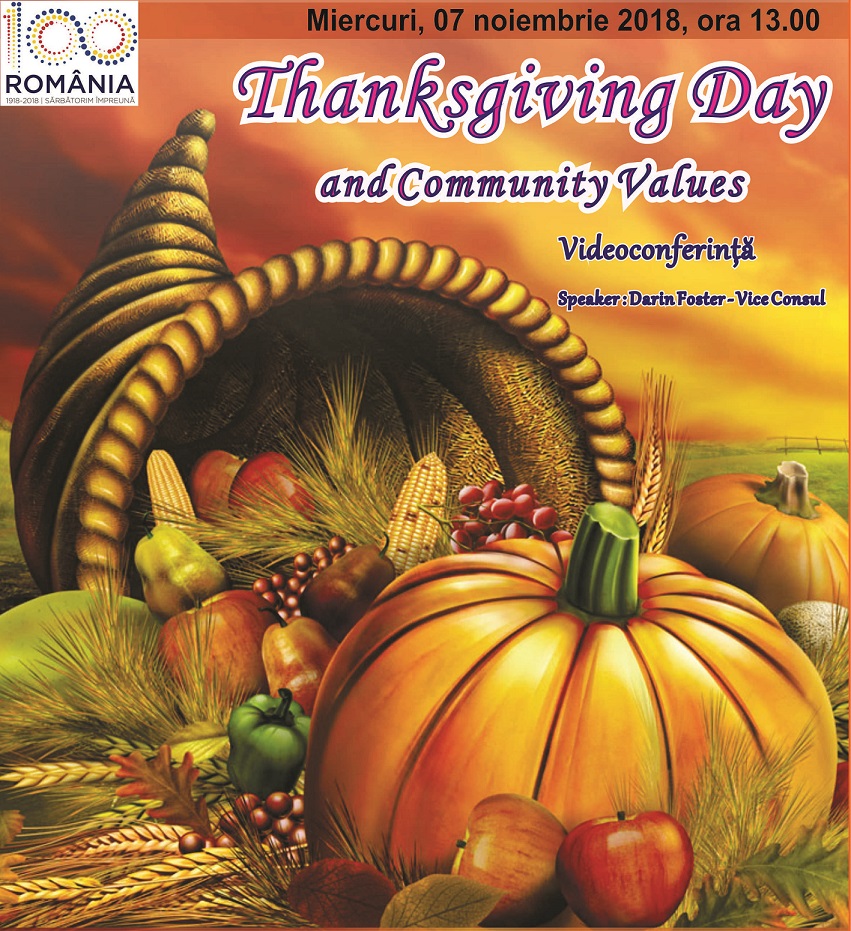 Biblioteca Județeană „Alexandru și Aristia Aman organizează miercuri, 07.11.2018, începând cu ora 13:00, în sala „Marin Sorescu”, videoconferința cu tema: „Thanksgiving Day and Community Values”, susținută de Darin Foster, Vice-Consul în cadrul Ambasadei SUA la București.