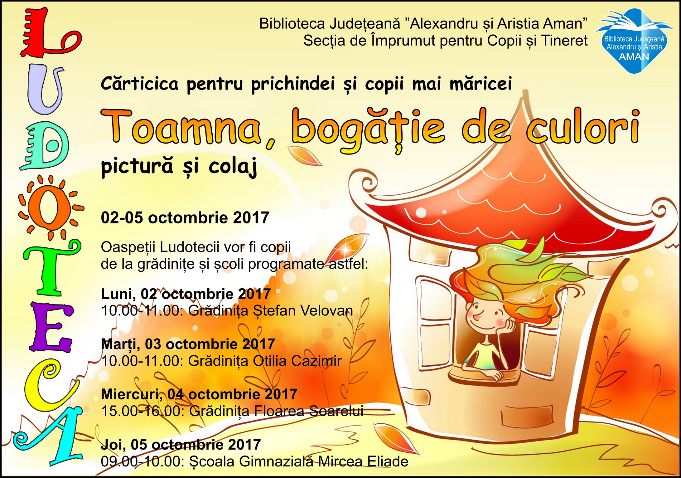 Luni, 2 octombrie 2017, Biblioteca Județeană “Alexandru și Aristia Aman” inițiază prima temă a proiectului “Cărticica pentru prichindei și copii mai măricei”. Ca atare, în săptămâna 02-05 octombrie,se va desfășura temaToamna, bogăție de culori – pictură/colaj.