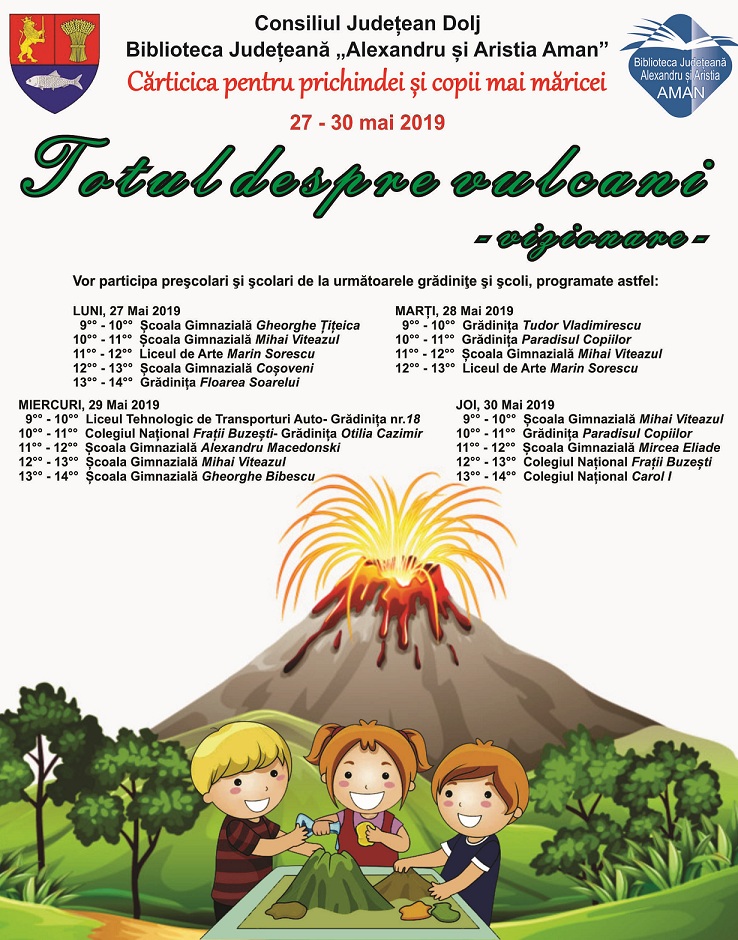 Biblioteca Județeană „Alexandru și Aristia Aman” organizează, în intervalul 27-30 mai 2019, activitatea cu titlul „Totul despre vulcani – vizionare”. Acțiunea se desfășoară în cadrul proiectului „Cărticica pentru prichindei și copii mai măricei” și are menirea de a-i familiariza pe participanți cu apariția, forma și compoziția vulcanilor de pe Terra.