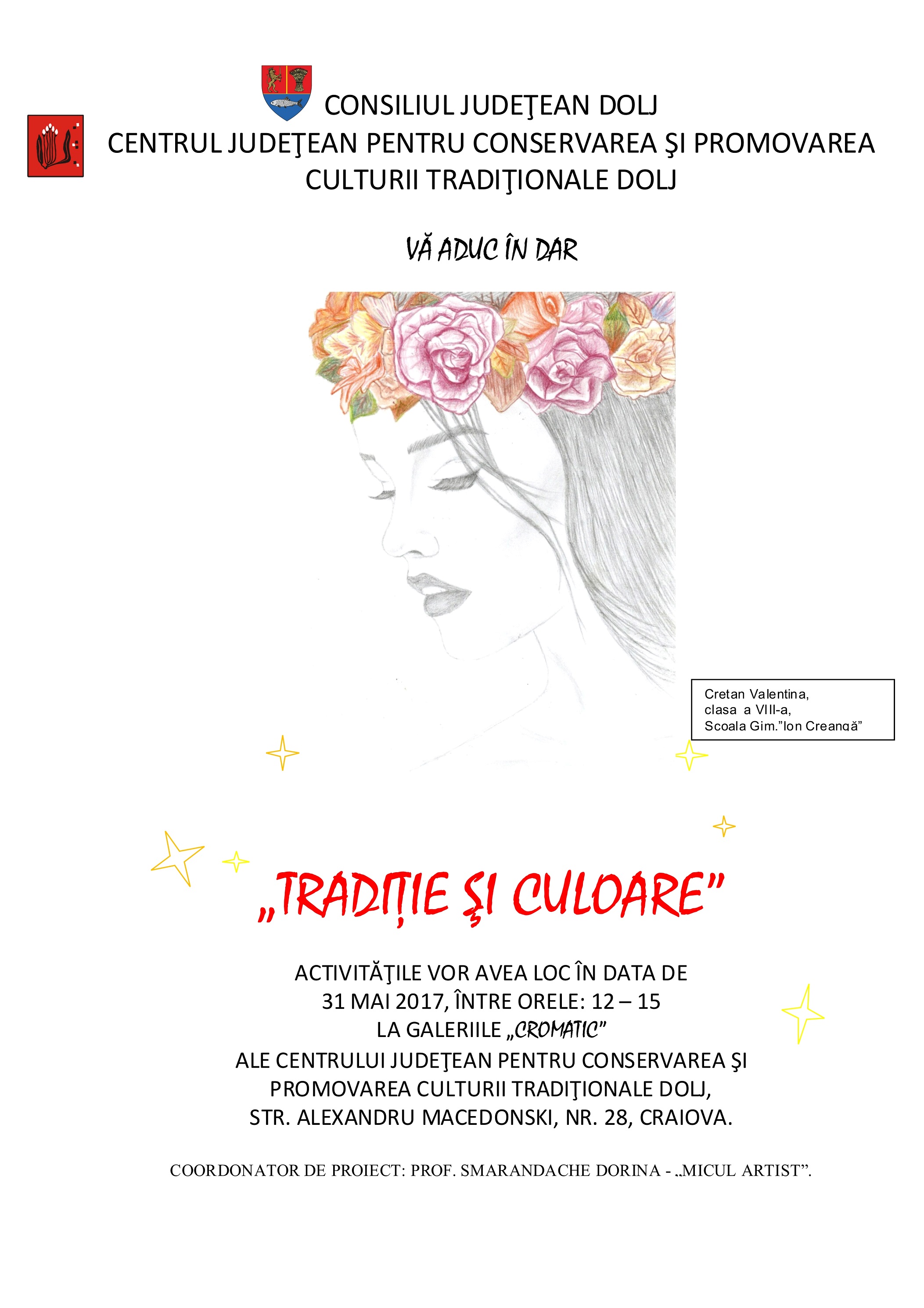 Consiliul Judeţean Dolj, Centrul Judeţean pentru Conservarea şi Promovarea Culturii Tradiţionale Dolj organizează alături de copii talentaţi şi profesorii lor evenimentul „Tradiţie şi culoare“, miercuri, 31 mai 2017, între orele 12:00 – 15:00, în Galeriile „Cromatic“.