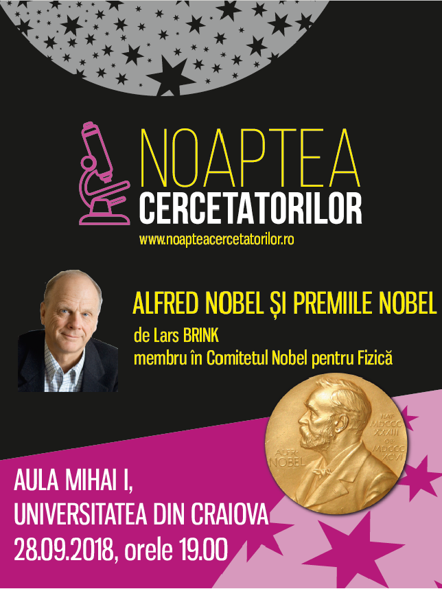 În cadrul ScienceCafé se va desfășura conferința științifică „Alfred Nobel și premiile Nobel” susținută de prof. dr. Lars BRINK de la Institutul de Tehnologie Chalmers, membru al Academiei Suedeze de Științe, membru al Comitetului Nobel pentru Fizică.