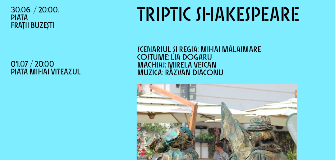 Casa de Cultură „Traian Demetrescu”, Craiova vă invită vineri 30 iunie, ora 20:00, în Piața „Frații Buzești” și sâmbătă, 1 iulie, de la aceeași oră în Piața „Mihai Viteazul”, la spectacolul de statui vivante – Triptic Shakespeare, regizat de Mihai Mălaimare.