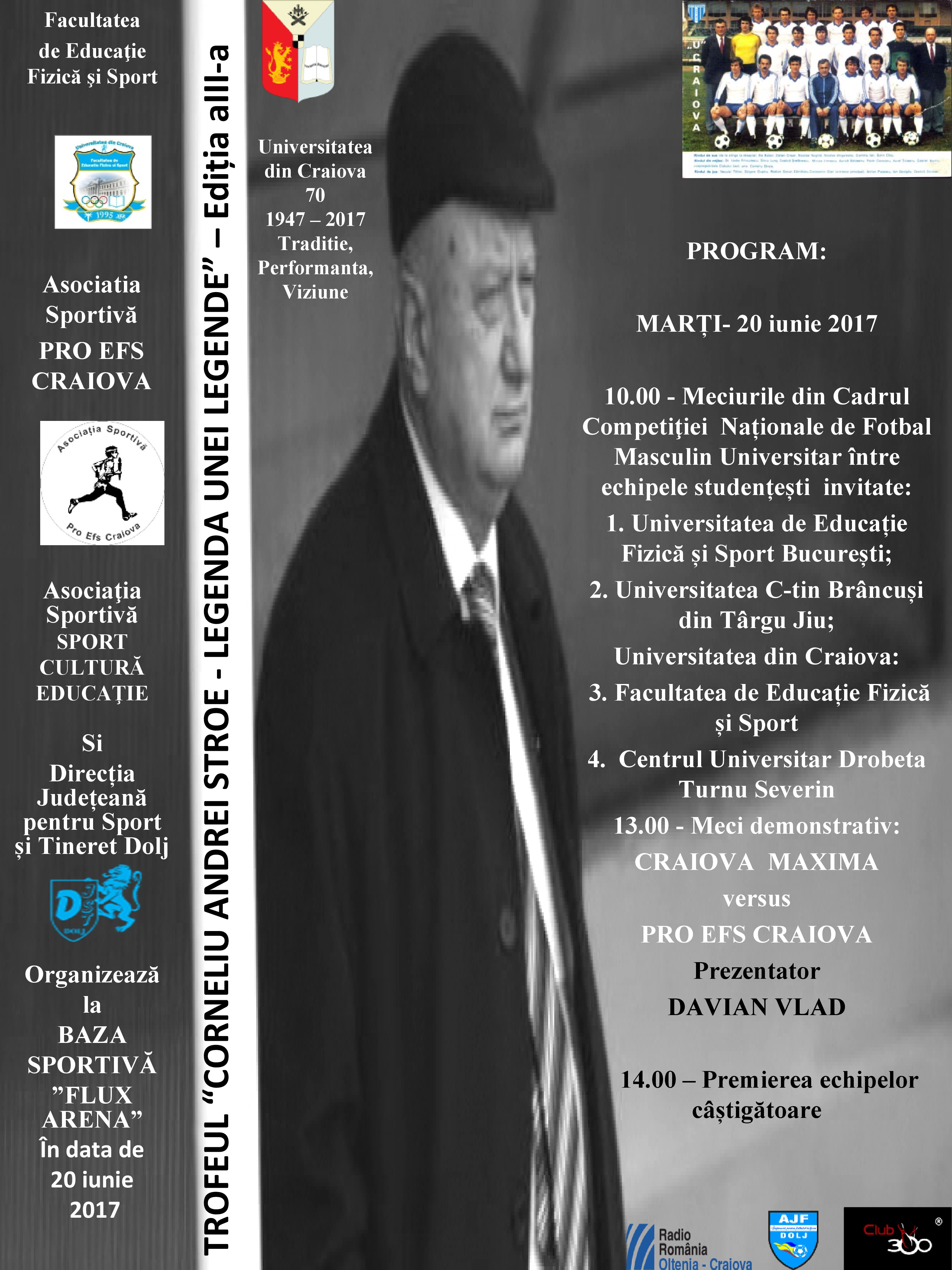 Facultatea de Educaţie Fizică şi Sport, Asociația Sportivă PRO EFS CRAIOVA, Asociaţia Sportivă Sport Cultură Educație și Direcția Județeană pentru Sport și Tineret Dolj organizează mâine, 20 iunie 2017, Trofeul “CORNELIU ANDREI STROE – LEGENDA UNEI LEGENDE” – Ediția aIII-a. Evenimentul se va desfășura la Baza sportivă ”Flux Arena”.
